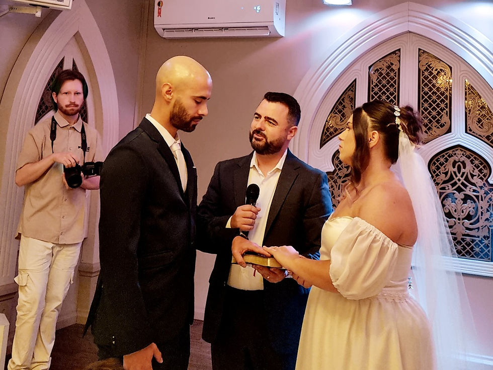 Sou Uilialdo Barreto, celebrante há mais de 10 anos, e meu trabalho vai muito além de apenas conduzir uma cerimônia. Meu primeiro passo é conhecer os noivos, entender suas histórias, expectativas e criar um roteiro que respeite suas crenças, valores e estilo – seja ele tradicional, religioso ou civil. Mais do que isso, busco me conectar de verdade, para que minha presença torne esse dia ainda mais especial, não só para os noivos, mas para todos os familiares e amigos presentes.